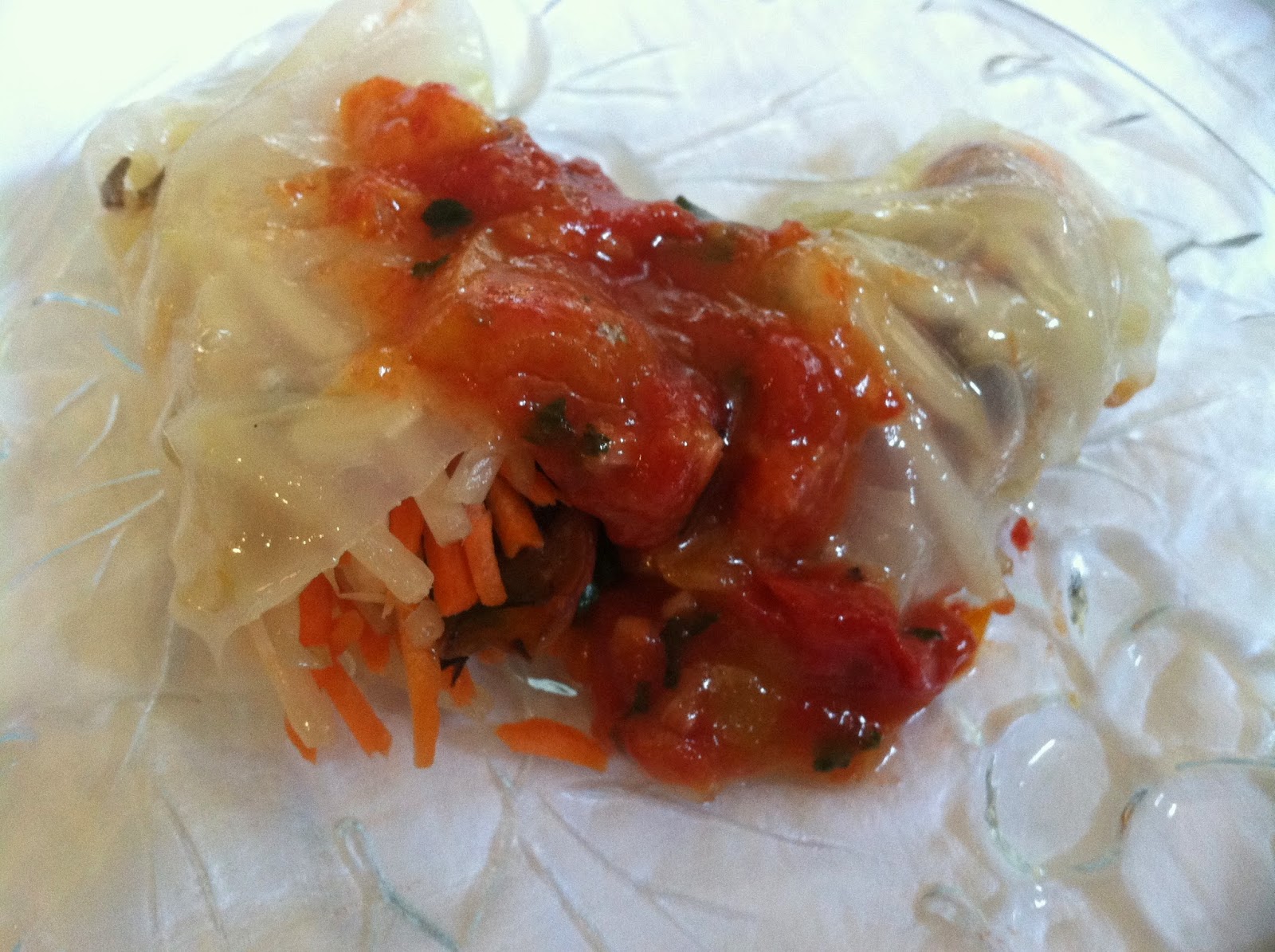 7. Layer the following ingredient on center of wrapper: bean sprouts, shredded carrots,